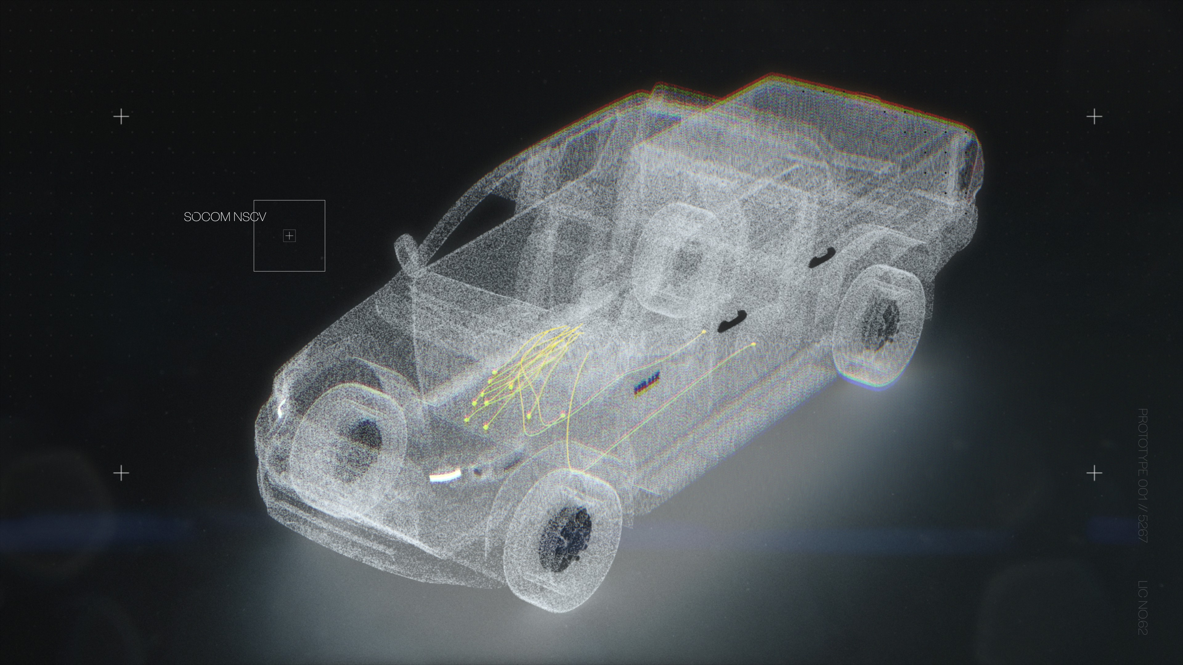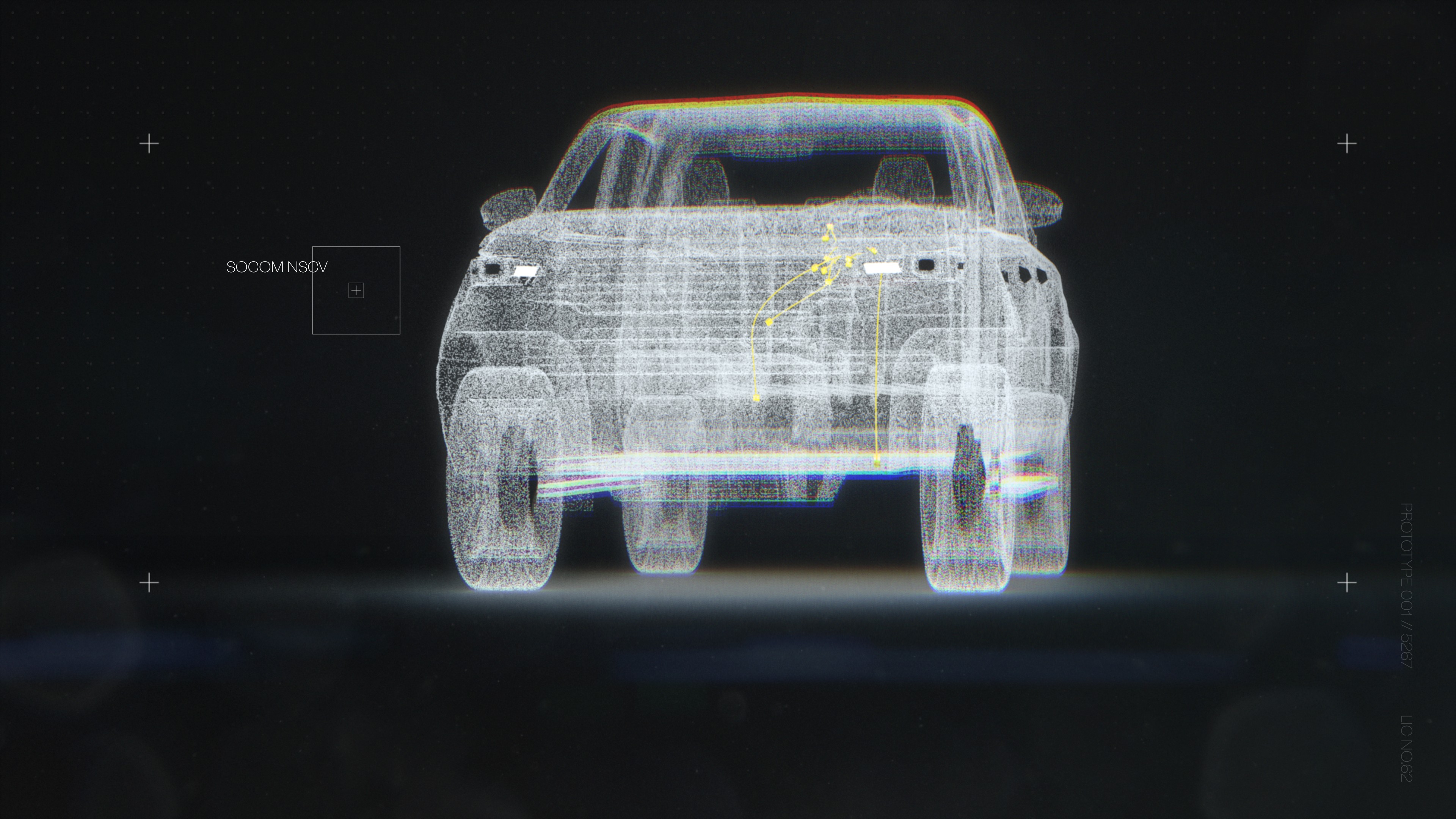 We developed a suite of 3D content spanning a hero animation, motion identity, and web assets. The centerpiece was a 30-second spot for the Hilux Toyota launch at a 2026 event, featuring a fly-through animation of a base car chassis rendered in a point-cloud, military-grade holographic style before transitioning into live-action footage. We also animated the Raglan logo into a full motion identity and produced a library of 360-degree vehicle animations for the website, covering platforms across their lineup. Each vehicle starts in a dark metallic finish and transitions into a holographic x-ray look that reveals internal components, wiring paths, and integration points, giving an abstract but clear sense of the reverse engineering and custom systems work that defines what Raglan does.